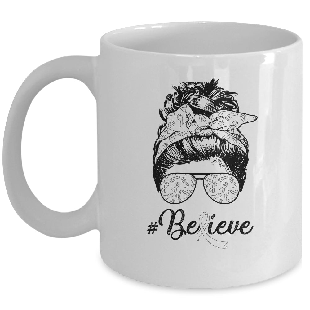 Lung Cancer Awareness Messy Bun Warrior Believe White Ribbon
